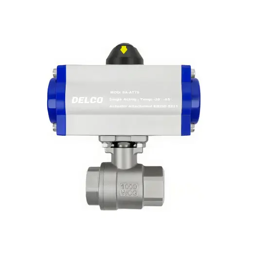 DELCO's DK66-2PS Series Pneumatic 2-Piece Threaded Ball Valve integrates a stainless steel ball valve with a pneumatic actuator. This valve is characterized by its simple, lightweight structure and low operating torque, making it suitable for small to medium-sized (DN15-DN50) low-pressure pipelines. It offers fast shut-off capability and excellent sealing, commonly used for automated or manual control in Water Treatment, HVAC (Heating, Ventilation, and Air Conditioning), and Gas Pipeline systems.